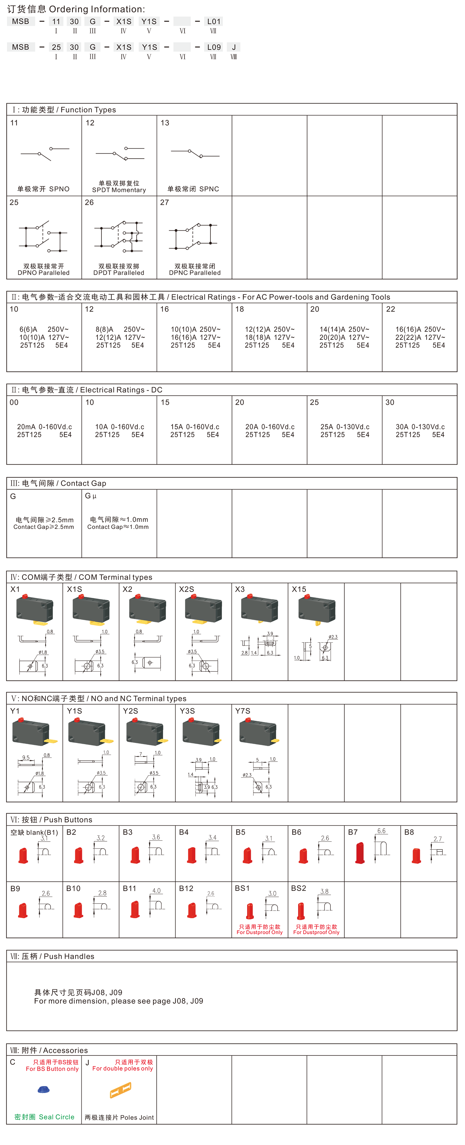 ◆MSB-G series are updated high rated type of MSB micro switches, optional micro contact and 2.5mm contact gap, optional Dustproof type with Seal Ring, special for used in high-rated DC power-tools and gardening tools, such as 42Vd.c up Cordless Miter Saws, 42Vd.c up Cordless High Pressure Cleaner, 42Vd.c up Cordless Electric Chain Saws, 42Vd.c up Cordless Grass Trimmers, 42Vd.c up Cordless Blowers, 42Vd.c up Cordless Hedge Trimmers, etc.