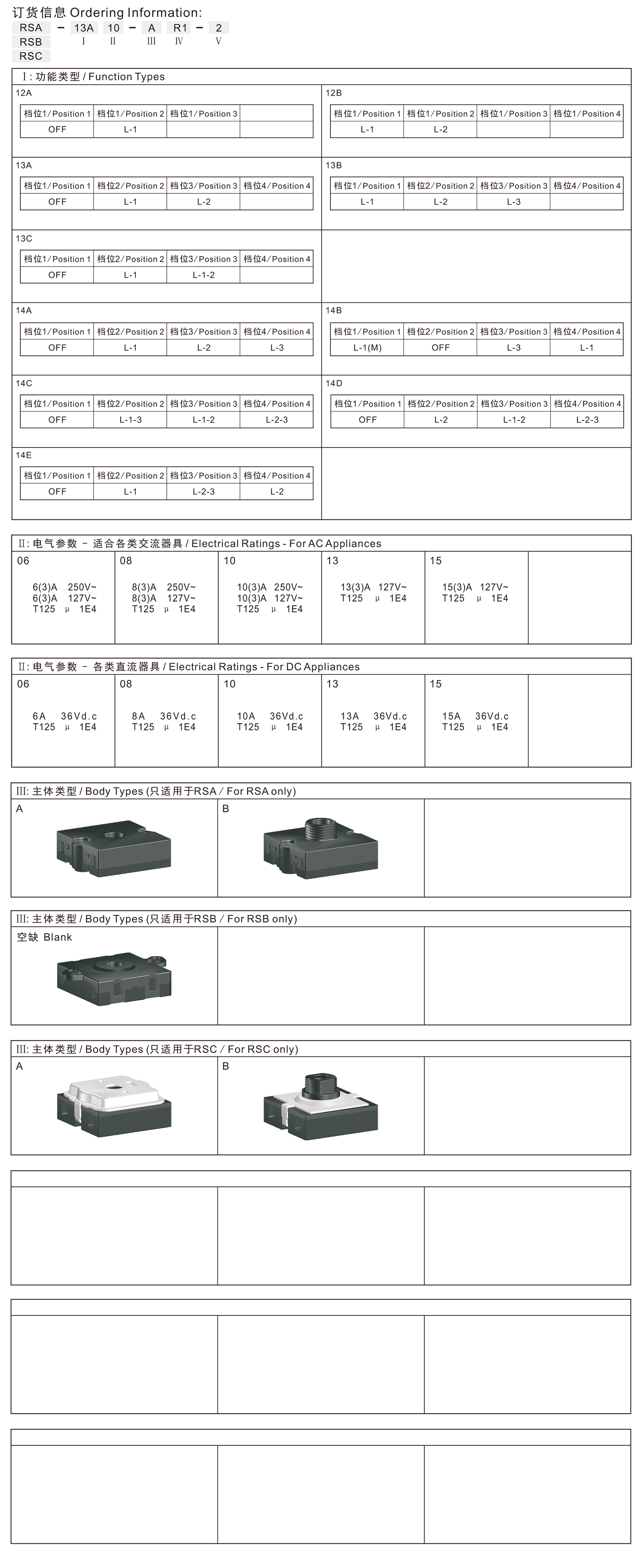 RSA, RSB, RSC series are general type rotary switches, for popular used in home appliances such as: Slower Cookers, Food Mixers, Full Automatic Soya-bean Milk Machines, Juicers, Vacuum Cleaner, Electric Fan, Air Condition Fan, Table Lamps, etc. Also for used in some special Power-tools and Gardening tools, such as: Heat Guns, Electric Blowers, etc.
