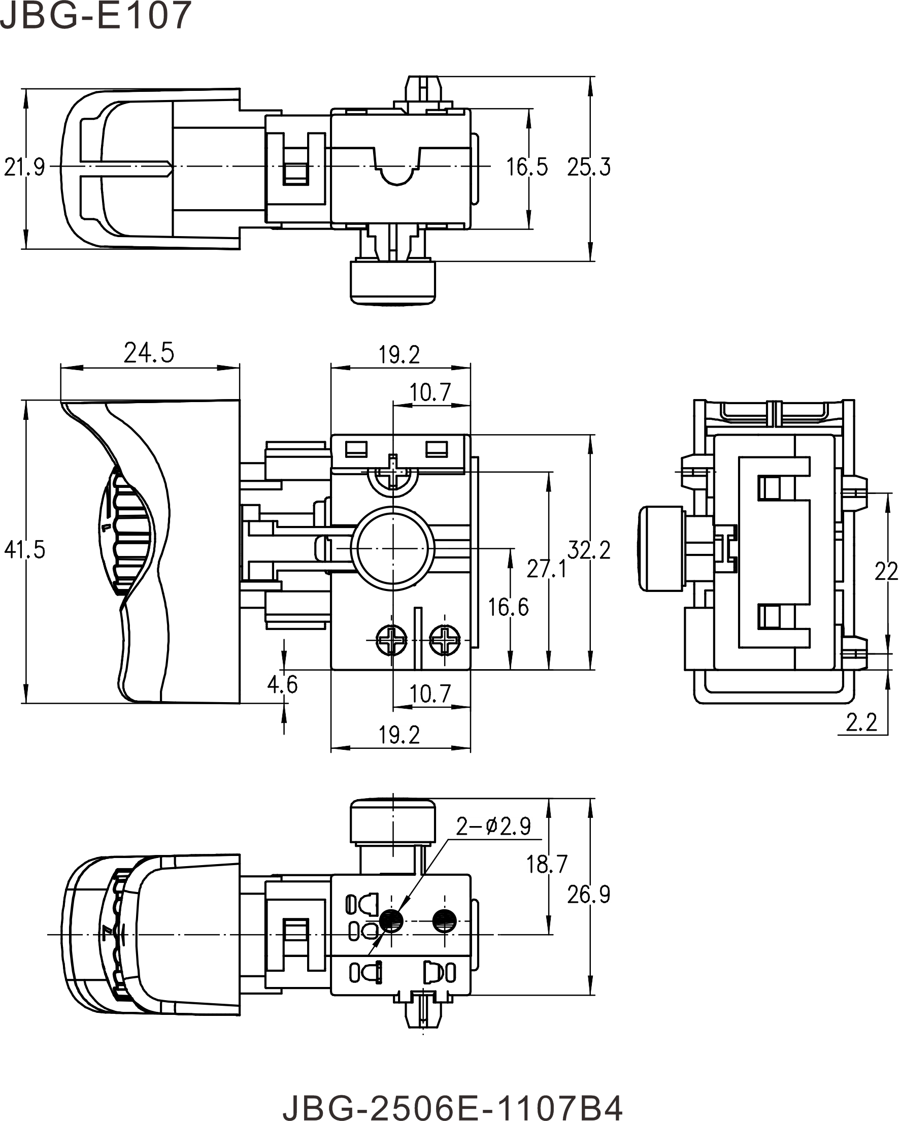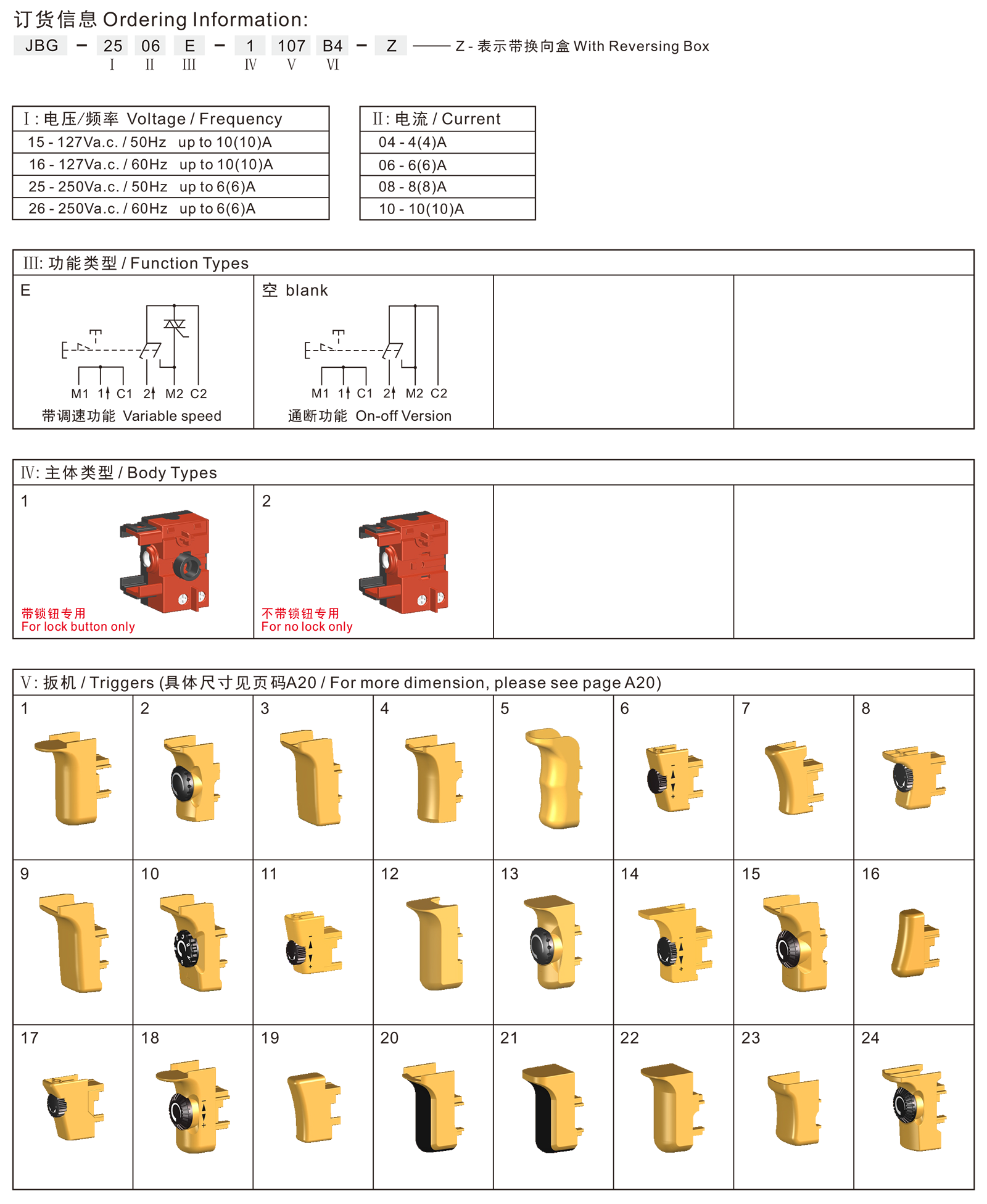 JBG series are one mini-type variable speed trigger switches, integrated dustproofwith compact size, the handle of tools can be designed to more fine. For popular used in portable power-tools such as: Drills, Impact Drills, Rotary Hammers, Jig Saws, Reciprocating Saws, Sabre Saws, Electric Mixers, Polishers, Orbit Sanders, etc.