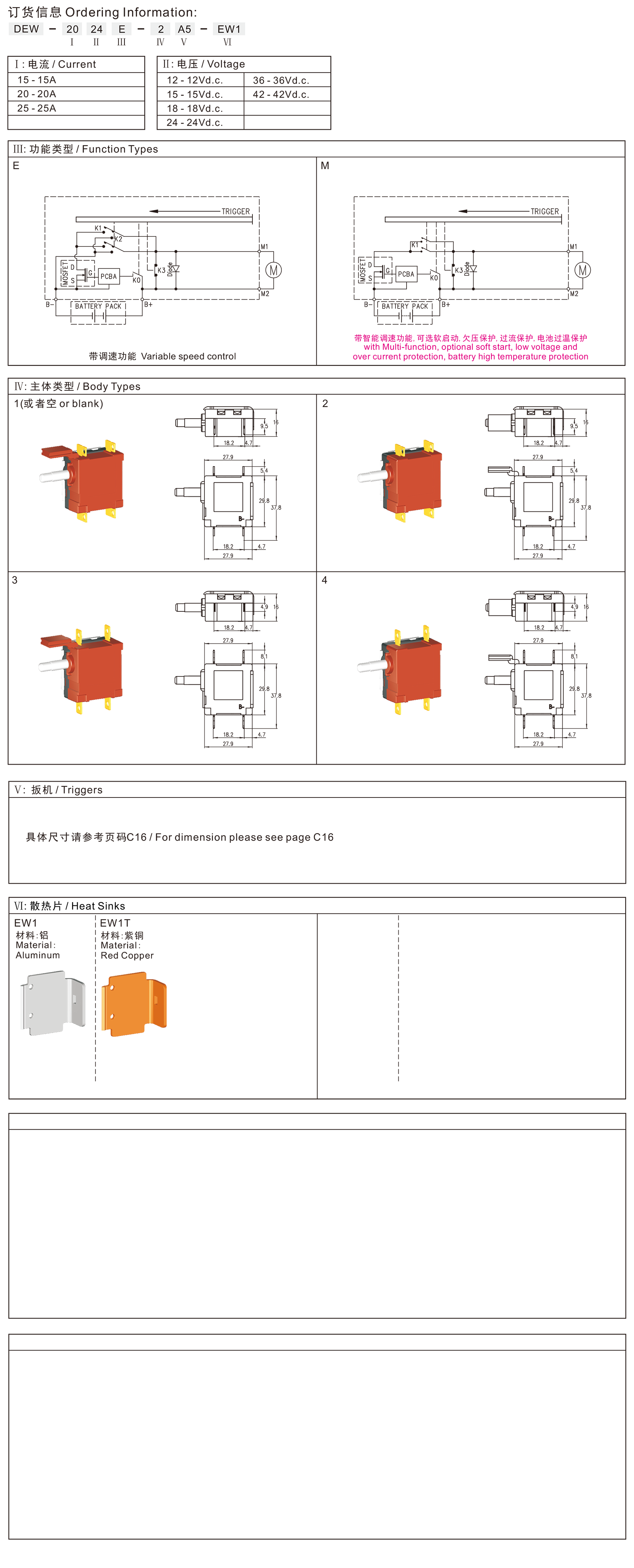 DEW series are one general type DC variable speed trigger switches, integrated dustproof and mechanical brake contact, without reversing box, commonly for used in DC portable power-tools and gardening tools such as: Cordless Rotary Hammers, Cordless Reciprocating Saws, Cordless Jig Saws, Cordless Angle Grinders, Cordless Grass Trimmers, Cordless Blowers, etc.