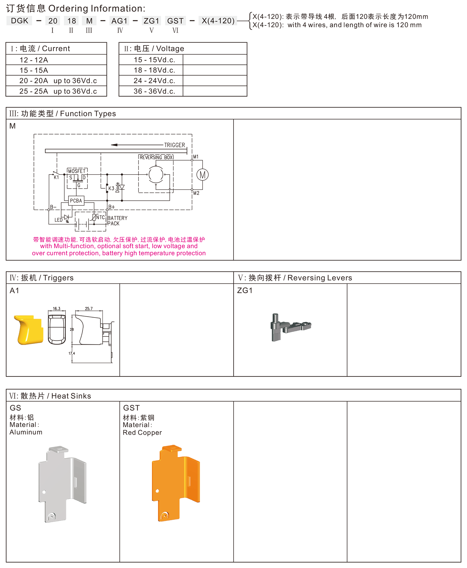 →智能调速功能,可带软启动,欠压保护,过流保护,电池过温保护