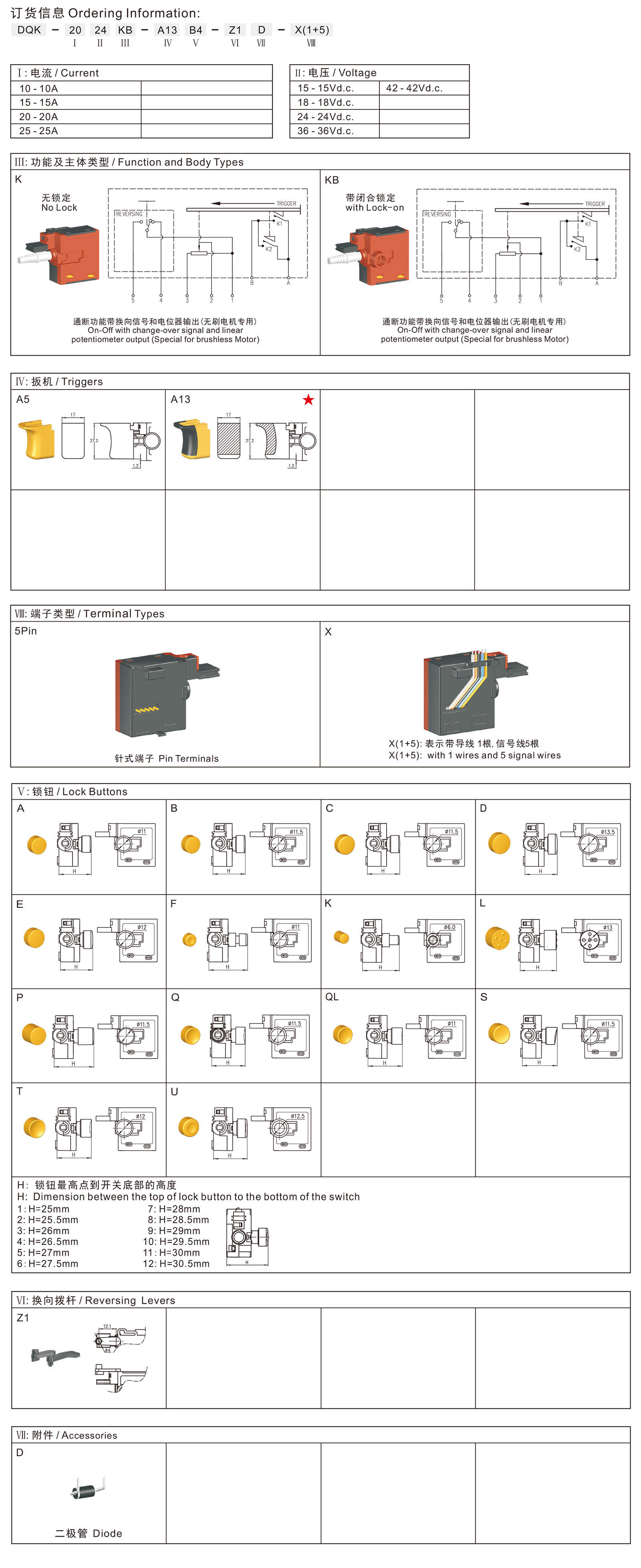 DQK series are special type DC trigger switches, integrated dustproof, designed specially for used in Brushless DC power-tools such as: Brushless Cordless Drills, Brushless Cordless Screw Drivers,Brushless Cordless Impact Wrenches, etc. With special design for assembly with PCB, needn't any wires.