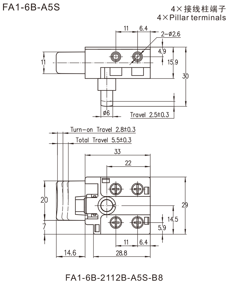 →2×接线柱端子 Pillar terminals φ=2.6mm or 2.8mm