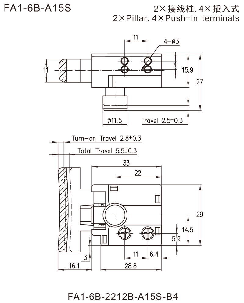 ◆FA1-6B系列是一款通用型的扳机开关,集成防尘功能,广泛应用于各类手持式电动工具,如:电钻、电锤、往复锯、曲线锯、搅拌器、型材切割机、石材切割机、电圆锯、电木铣、砂带机、砂光机、电刨、电动喷枪、电动钉枪,也可应用于电动园林工具,如:打草机、电链锯、电动割草机、电动扫雪机等。