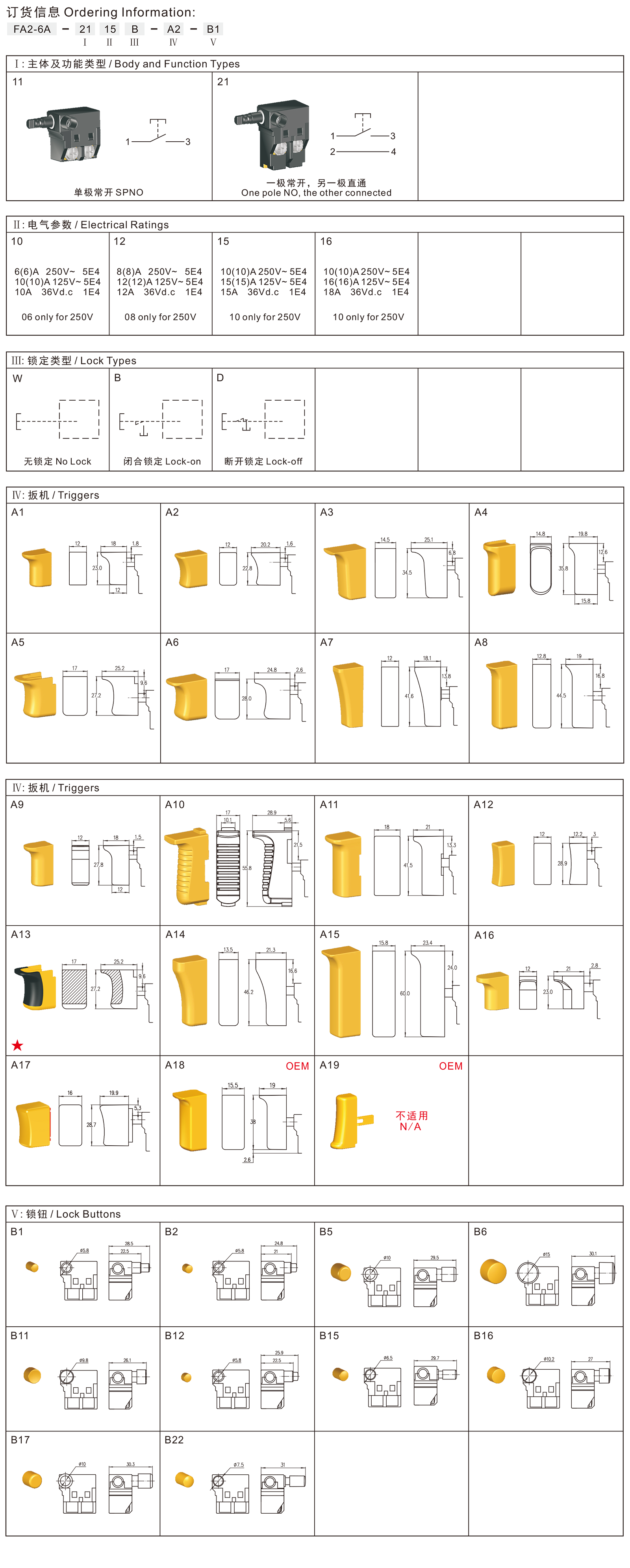 ◆FA2-6A series are one general type trigger switch, integrated dustproof, commonly for used in portable power tools such as Electric Drills, Marble Cutters, Circular Saws, Electric Routers, Belt Sanders, Electric Planers, etc.