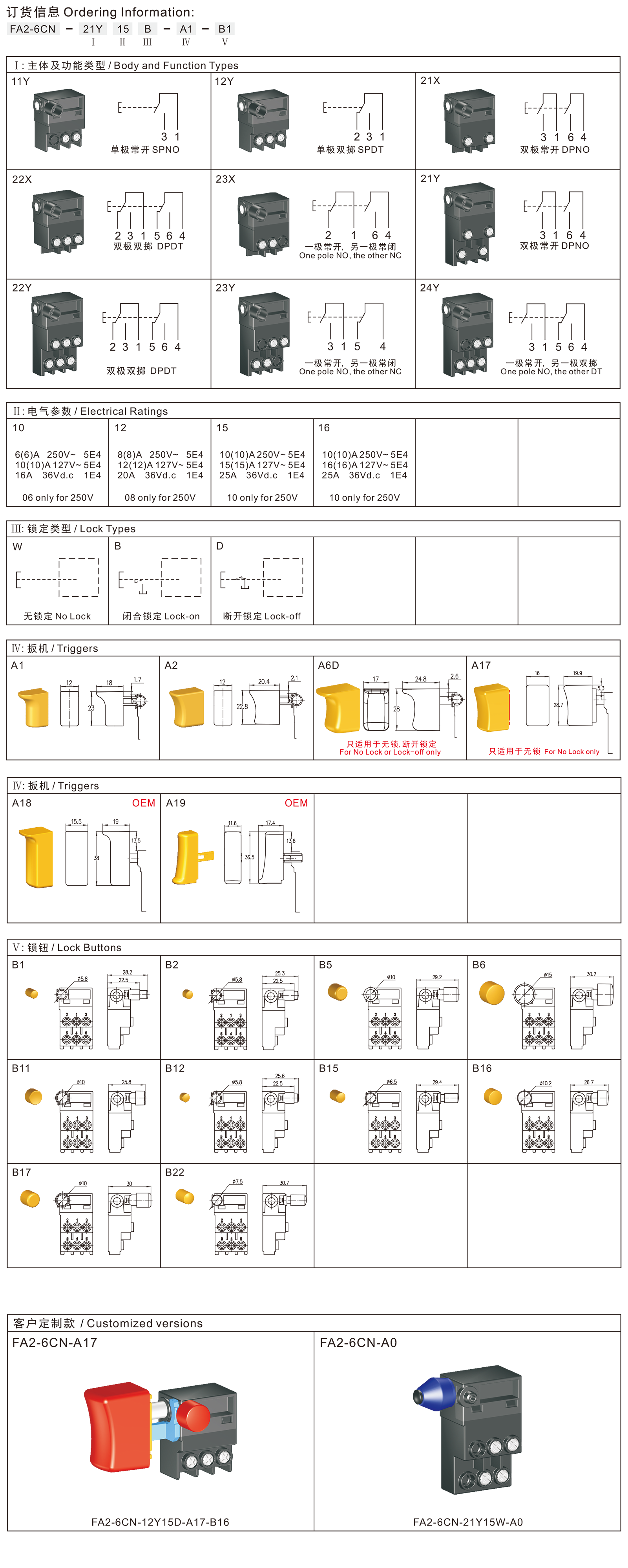 FA2-6CN series are one general type trigger switches, which is dustproof improved version of FA2-6C series, commonly for used in power tools such as Cut-off Machines, Miter Saws, Marble Cutters, Circular Saws, Electric Hammers, Electric Routers, Belt Sanders, Electric Planers, etc.