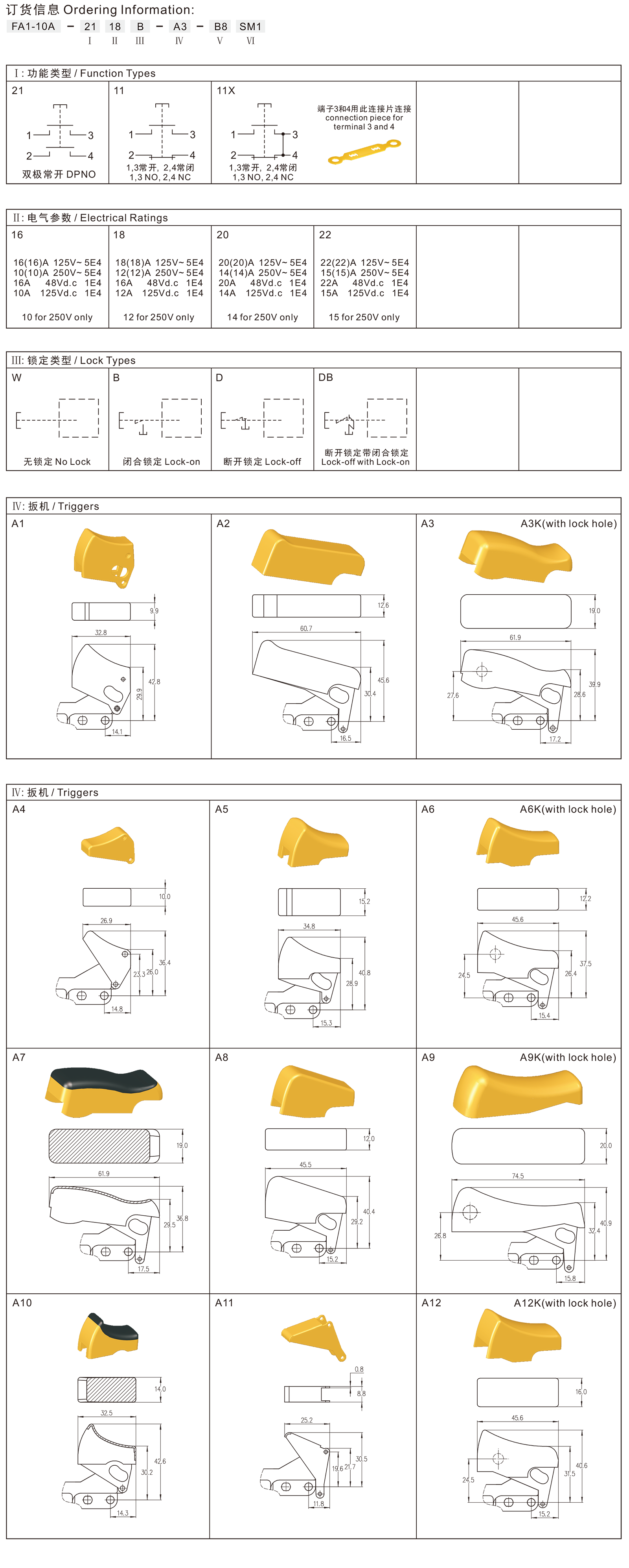 ◆FA1-10A series are general type high rated trigger switches,integrated dustproof, with snap-action structure, for used in high rated bench top or portable power-tools such as Cut-off Machines,Miter Saws, 150mm, 180mm and 230mm Large Angle Grinders, Polishers, Circular Saws, Rotary Hammers, Demolition Hammers, Electrics Chain Saws, etc.