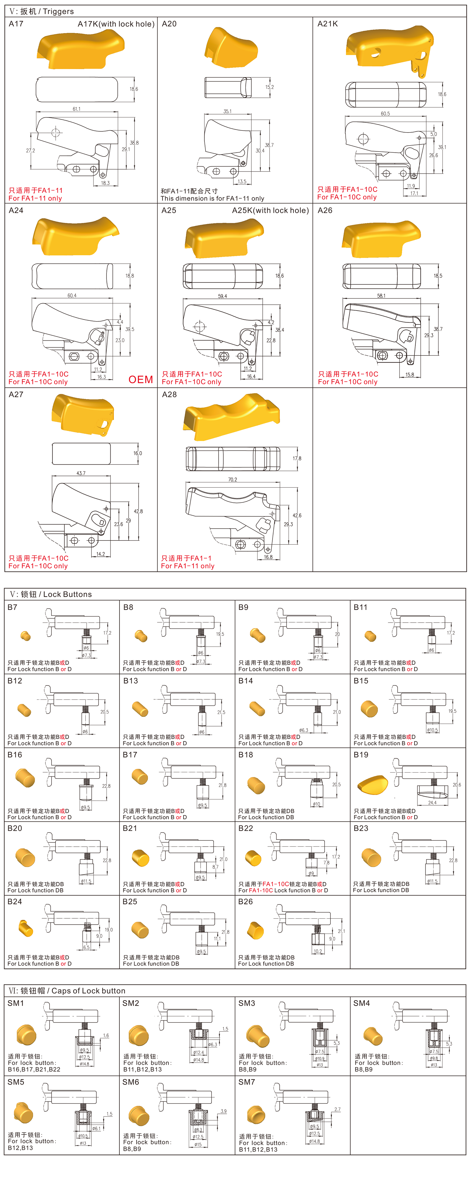 FA1-10C, FA1-11系列是一款通用性的大电流扳机开关,集成防尘功能内部为快速动作结构,适合大功率的台式和手持式电动工具以及园林工具,如:型材切割机、斜切锯(介铝机)、150、180和230大角磨、抛光机、电圆锯、电锤、电镐、电链锯等。