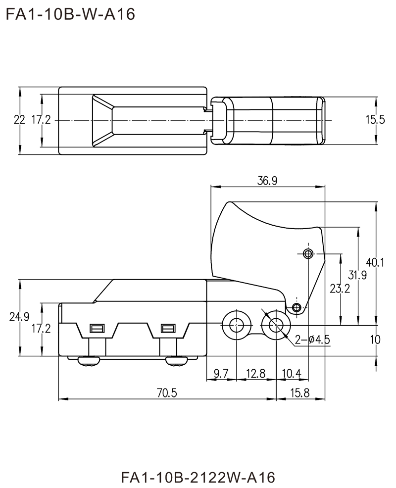 FA1-10B, FA1-10D series are general type high rated trigger switches, integrated dustproofwith snap-action structure, for used in high rated bench top, portable power-tools and gerdening tools such as Cut-off Machines, Miter Saws, 150mm, 180mm and 230mm Angle Grinders, Polishers, Circular Saws, Rotary Hammers, Demolition Hammers, Electric Chain Saws, etc.