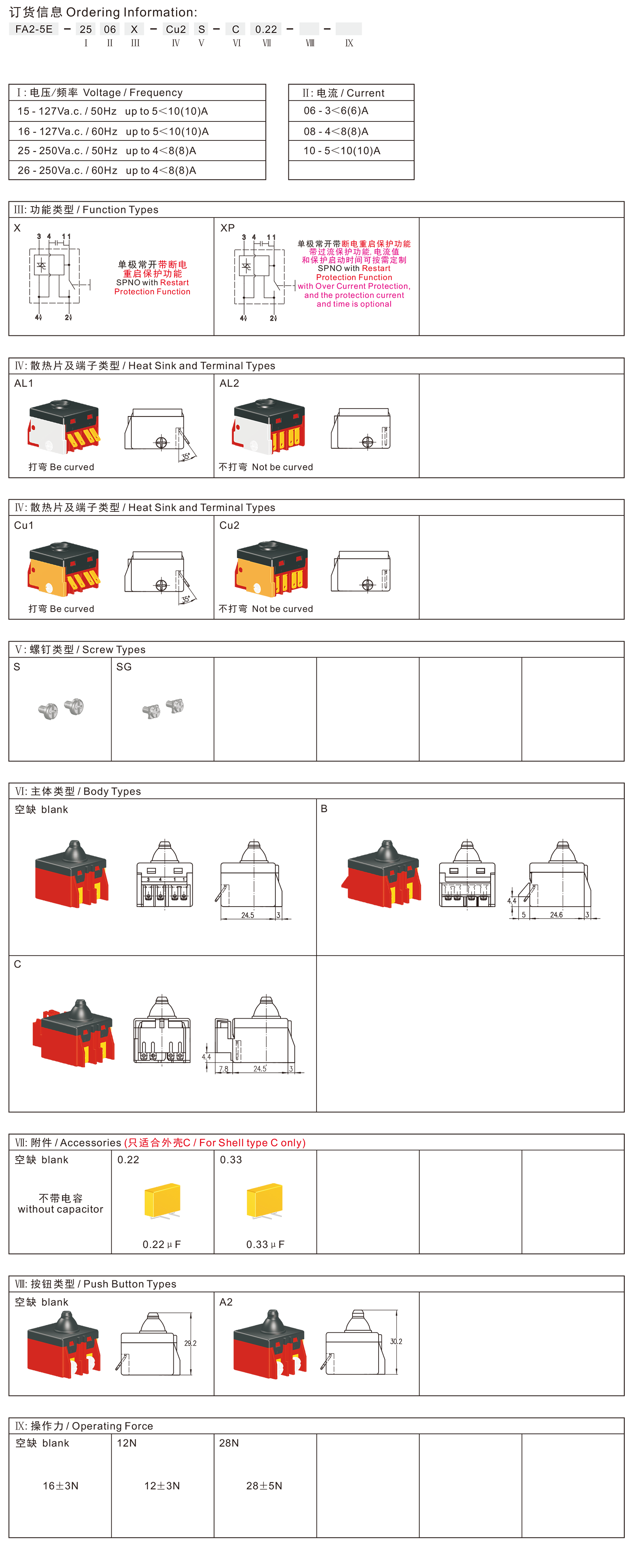 FA2-5E series are special type push-button switch, integrated dustproof, keep the same size with existing FA2-5N series, with restart protection when the power supply is interrupted (Electronics Type), designed specially for small angle grinders according to EN60947, fulfill the new requirement for zero voltage protection (or NVR), commonly for used in portable power-tools such as 100mm and 125mm Angle Grinders, Polisher Grinders, Die Grinders, etc.