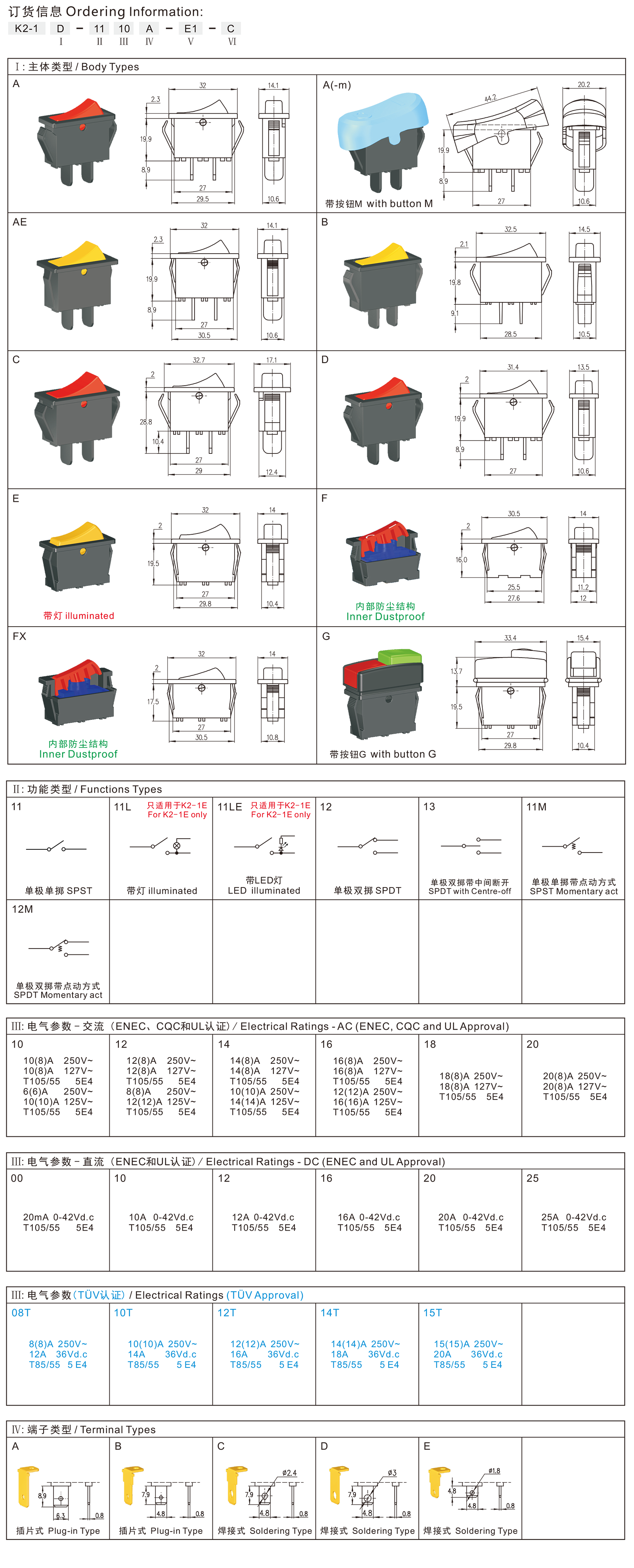 K2-1系列是一款标准型的跷板开关,也通称船型开关、波形开关等,有普通结构带防护罩防尘防水内部防尘结构两款可以选择,用途极广,装上防护罩后可实现防尘防水功能,广泛应用于各类家用电器及办公设备,如:热风枪、电吹风、电扇、打印机、家用吸尘器、干湿桶式吸尘器、高压清洗机等等。