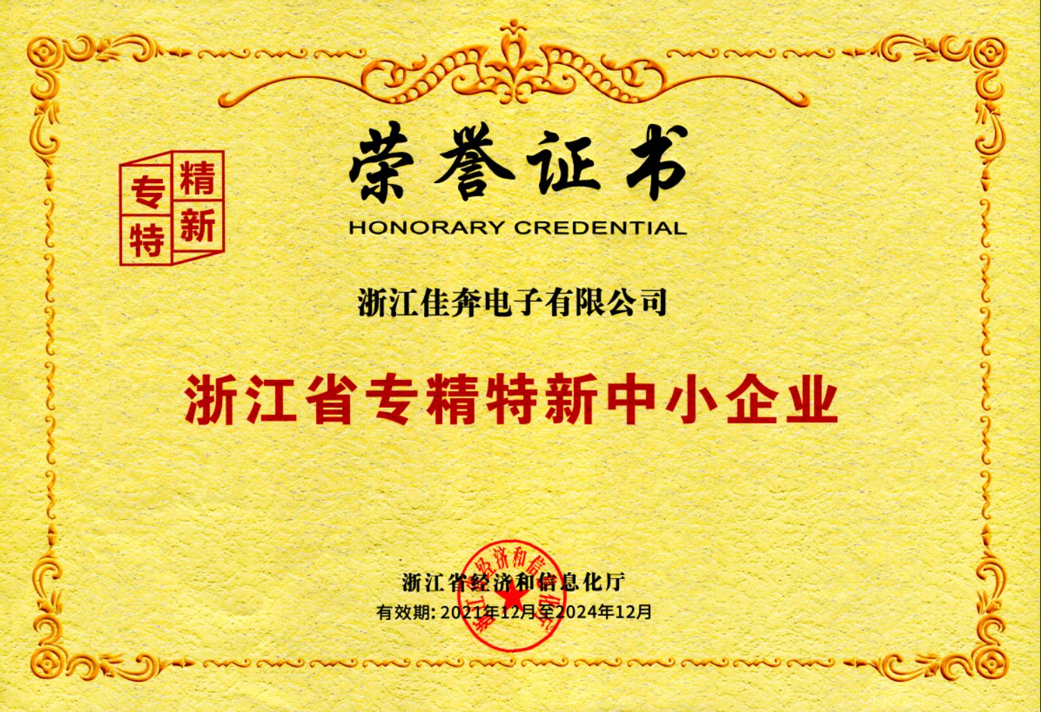 “浙江省专精特新中小企业”荣誉证书